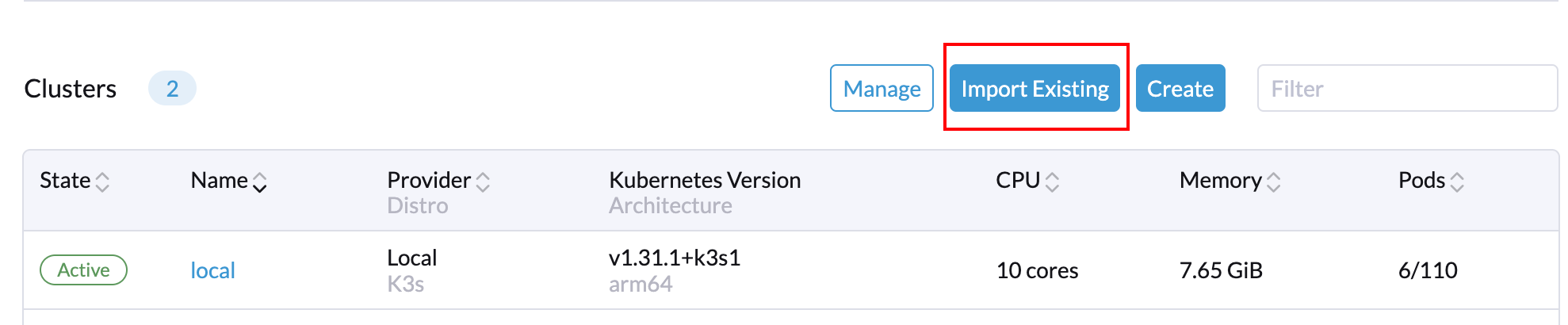curl --insecure -sfL https://192.168.49.4/v3/import/jcj5rdjs.yaml | kubectl apply -f -我们在宿主机执行kubectl 显然无法直接访问到内网地址192.168.49.4,但是由于我们前面创建Rancher时已经做了端口映射,这里我们直接替换一下curl的ip为127.0.0.1即可。大约等待10秒左右就可以在Rancher看到连接上的minikube集群。至此,设置完毕。